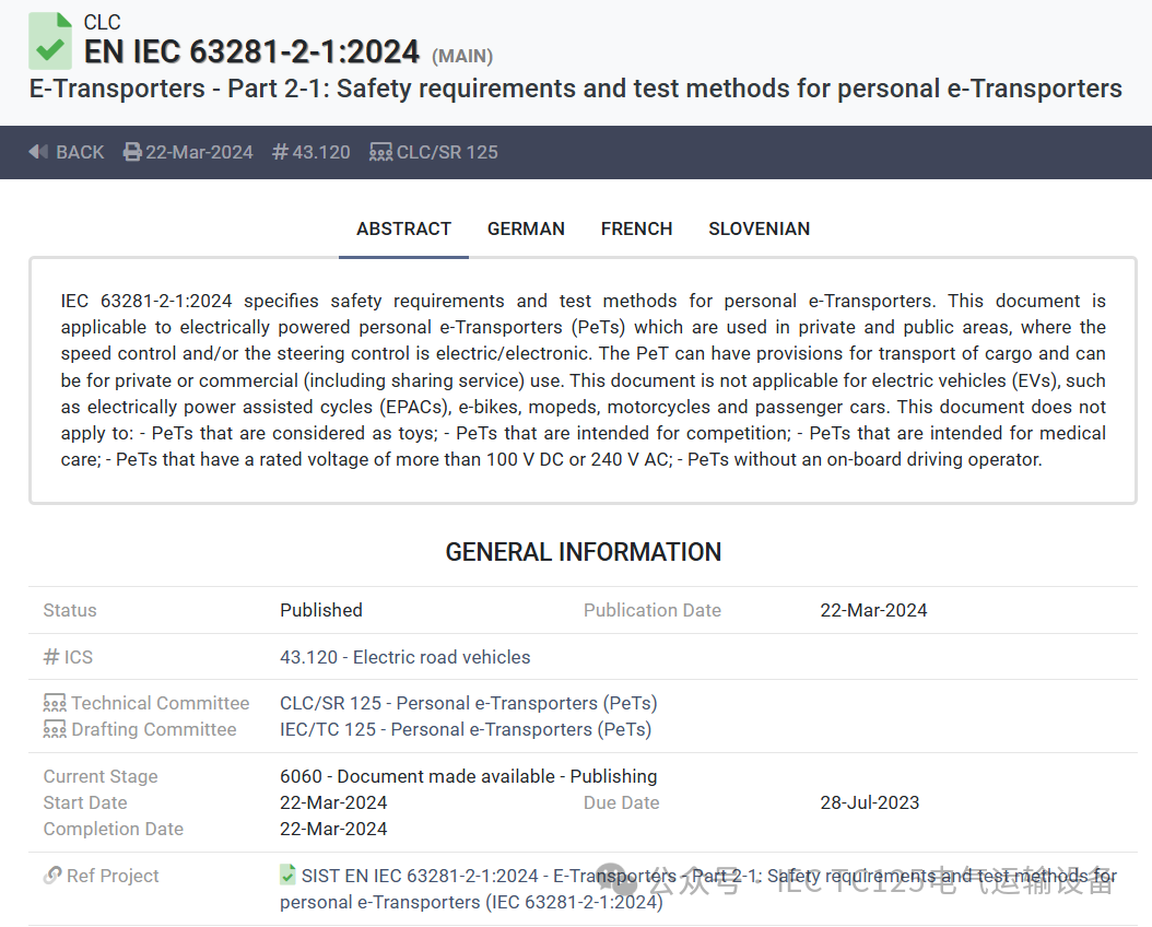 在全球化浪潮下,标准的统一与协调对于行业的可持续发展具有深远意义。IEC/TC125 四项标准的发布,为电气运输设备这一新兴品类提供了清晰的术语定义和明确的技术规范、测试方法,保障了产品的安全和质量。后续,在 IEC/TC125 标准的引领下,电气运输设备将打破地域壁垒,加速全球市场的融合与流通,促进产业链上下游的高效协同,激发企业的创新活力,推动技术不断迭代升级 ,以更卓越的性能、更环保的理念、更智能的特性,开启全球绿色交通、智慧物流的行业发展崭新篇章。