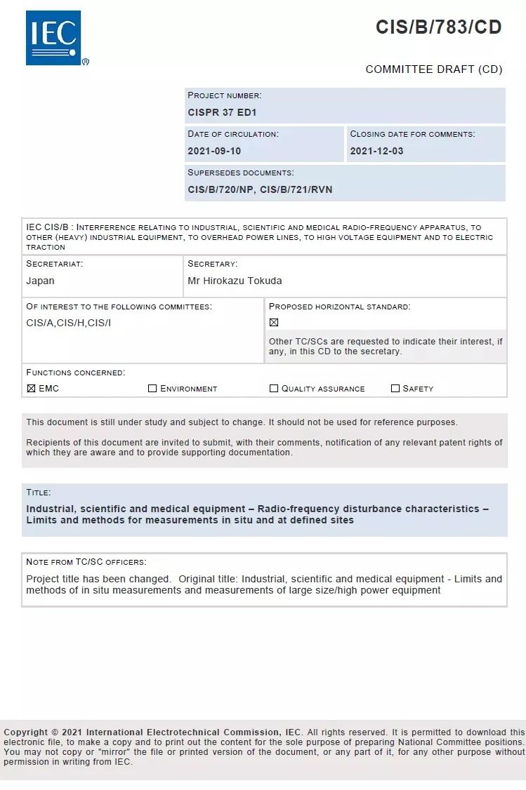 CISPR/B CISPR 37进入CD阶段